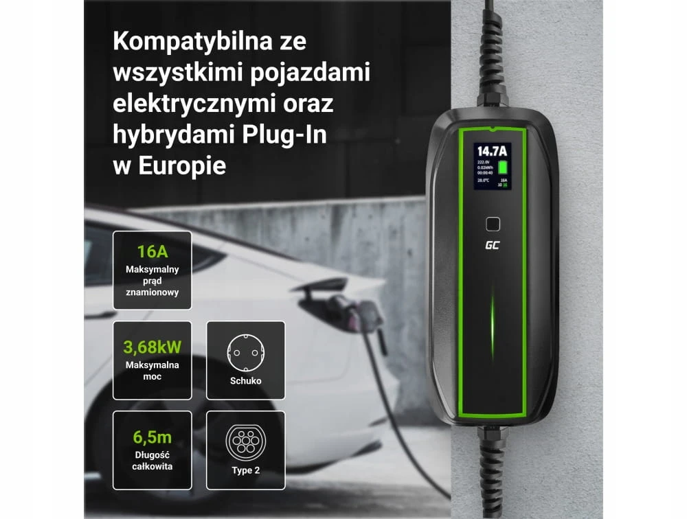 Green Cell GC PowerCable 3,6 kW to mobilna ładowarka EV zaprojektowana z myślą o kierowcach, którzy chcą ładować swój samochód elektryczny lub hybrydę plug-in w dowolnym miejscu, korzystając ze standardowego gniazda Schuko (230 V).