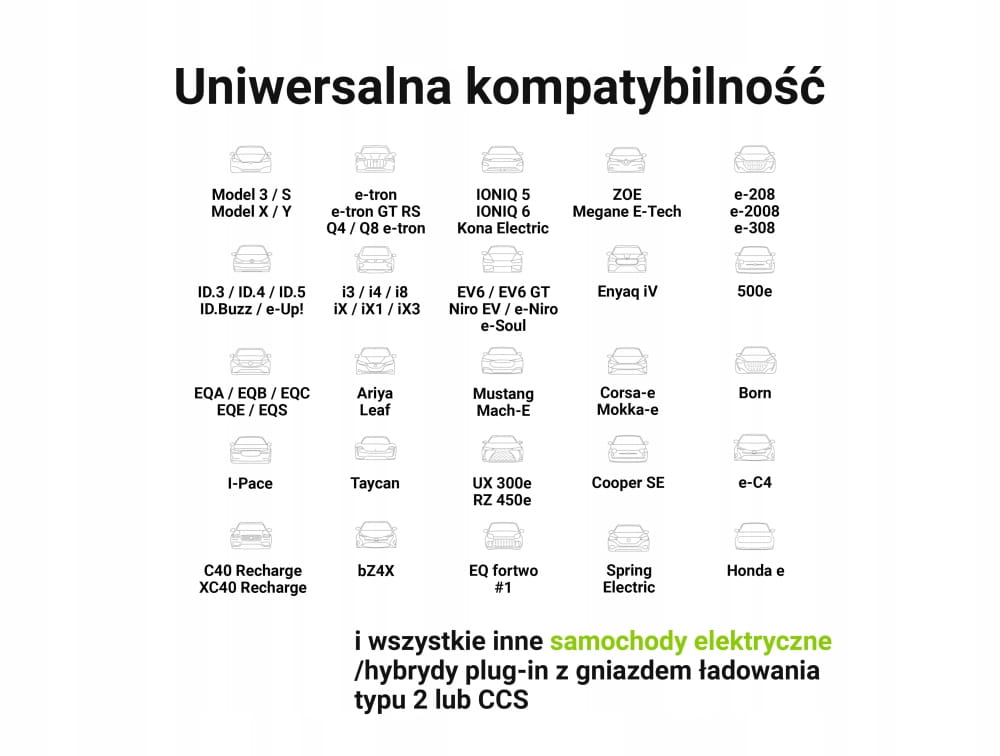 - Kompatybilność: EV i PHEV z gniazdem Type 2