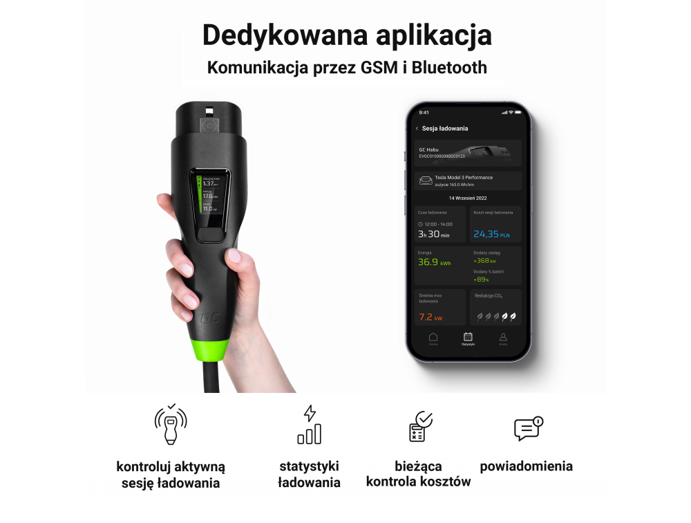 Mobilna ładowarka Green Cell GC Habu 11 kW została wyposażona w zaawansowane funkcje inteligentne, które zapewniają pełną kontrolę nad procesem ładowania – zarówno w domu, jak i w podróży.