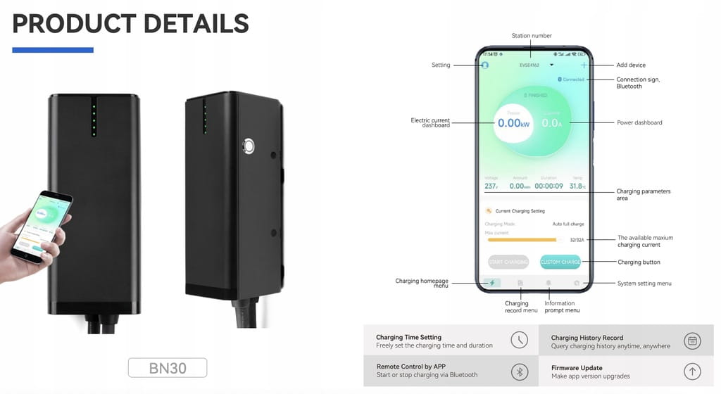 Dzięki mocy 11 kW, wtyczce CEE 16 A, zintegrowanemu kablowi, oraz wbudowanej ochronie DC 6 mA, model BN30 stanowi praktyczne i niezawodne rozwiązanie dla użytkowników, którzy oczekują prostoty, bezpieczeństwa i wysokiej jakości wykonania.