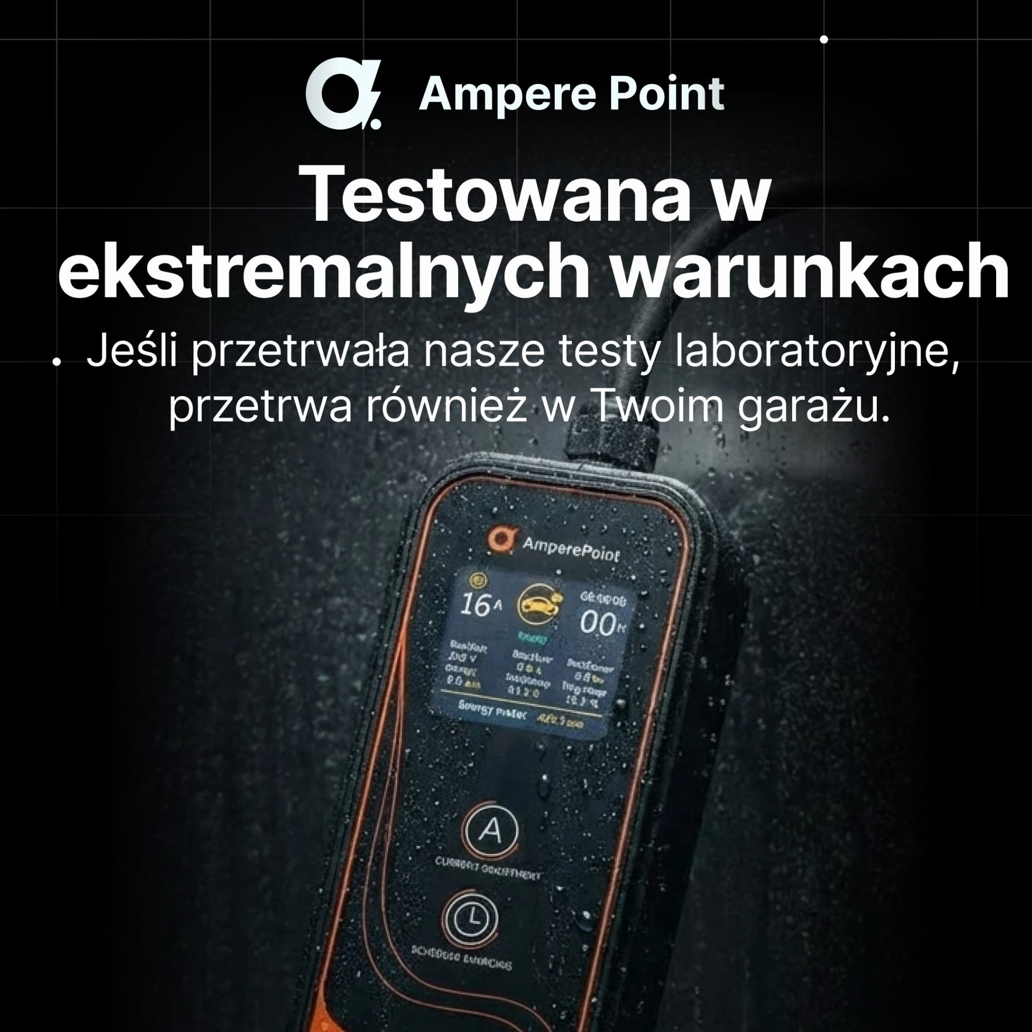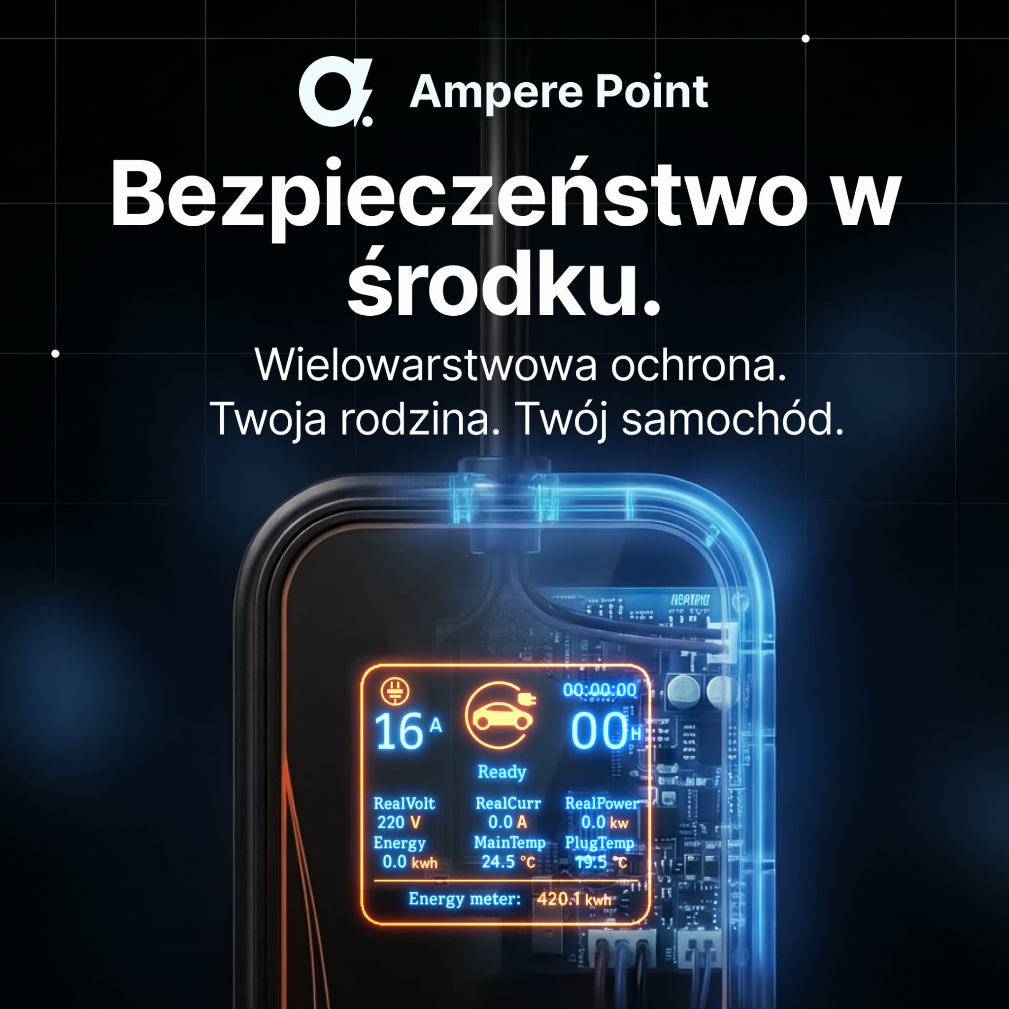 Ampere Point P35 (6 m, 3,7 kW) to nowoczesna, bezpieczna i funkcjonalna ładowarka przenośna, która zapewnia pełną kontrolę nad procesem ładowania oraz rzeczywistym zużyciem energii.
