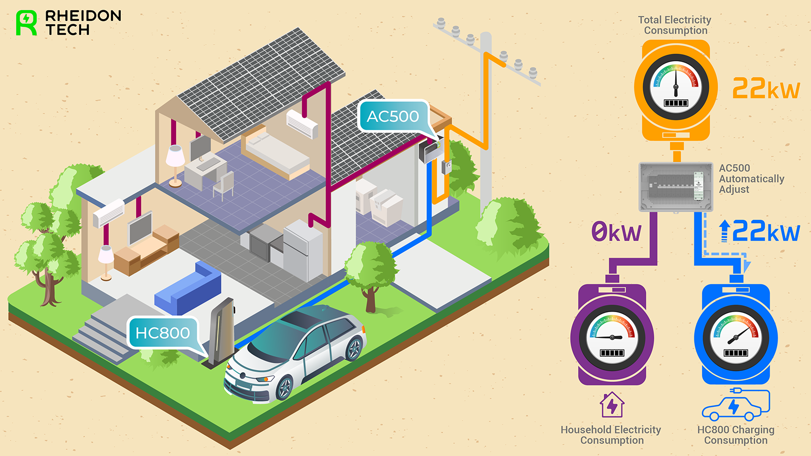 Rheidon AC500 Smart Load Balancer to inteligentne rozszerzenie systemu ładowania, które pozwala w pełni wykorzystać możliwości instalacji elektrycznej bez ryzyka przeciążeń i bez konieczności kosztownej modernizacji przyłącza. Dzięki funkcjom Dynamic Load Balancing, Peak Shaving oraz obsłudze nadwyżek energii z fotowoltaiki, urządzenie zapewnia maksymalną efektywność energetyczną i stabilność pracy całego systemu.
